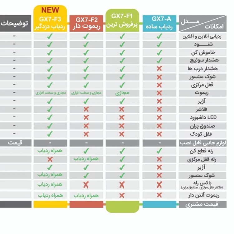 امکان ردیابی آنلاین و آفلاین قابلیت اضافه کردن آژیر و شوک سنسور قابلیت خاموش کردن خودرو از طریق گوشی قابلیت هشدار باز شدن درب ها و سوییچ و جابجایی خودرو با جرثقیل قابلیت قفل و باز درب خودرو از روی گوشی هشدار سوییچ دارای میکروفن ساخت ایران دو سال گارانتی شرکتی
